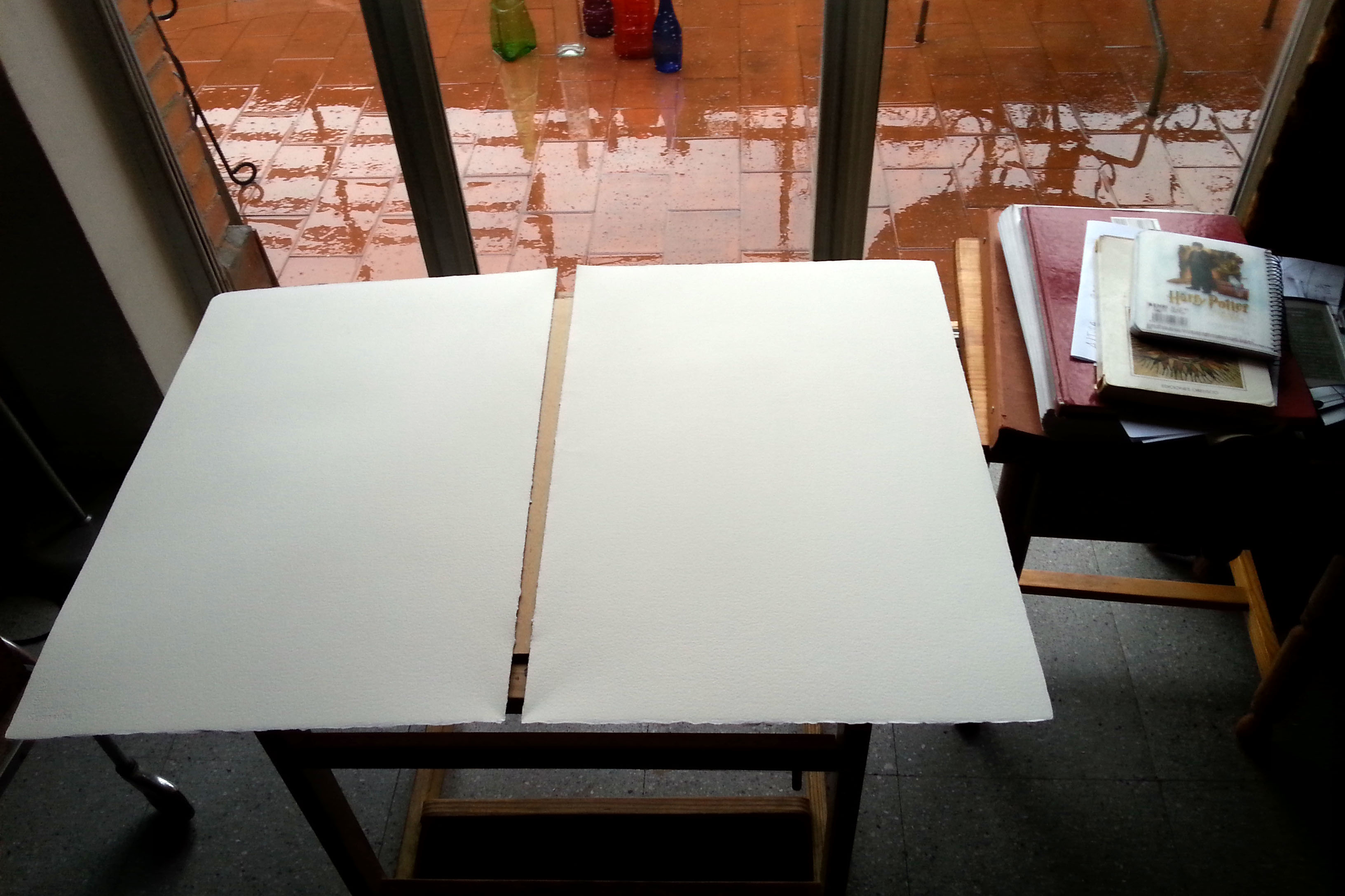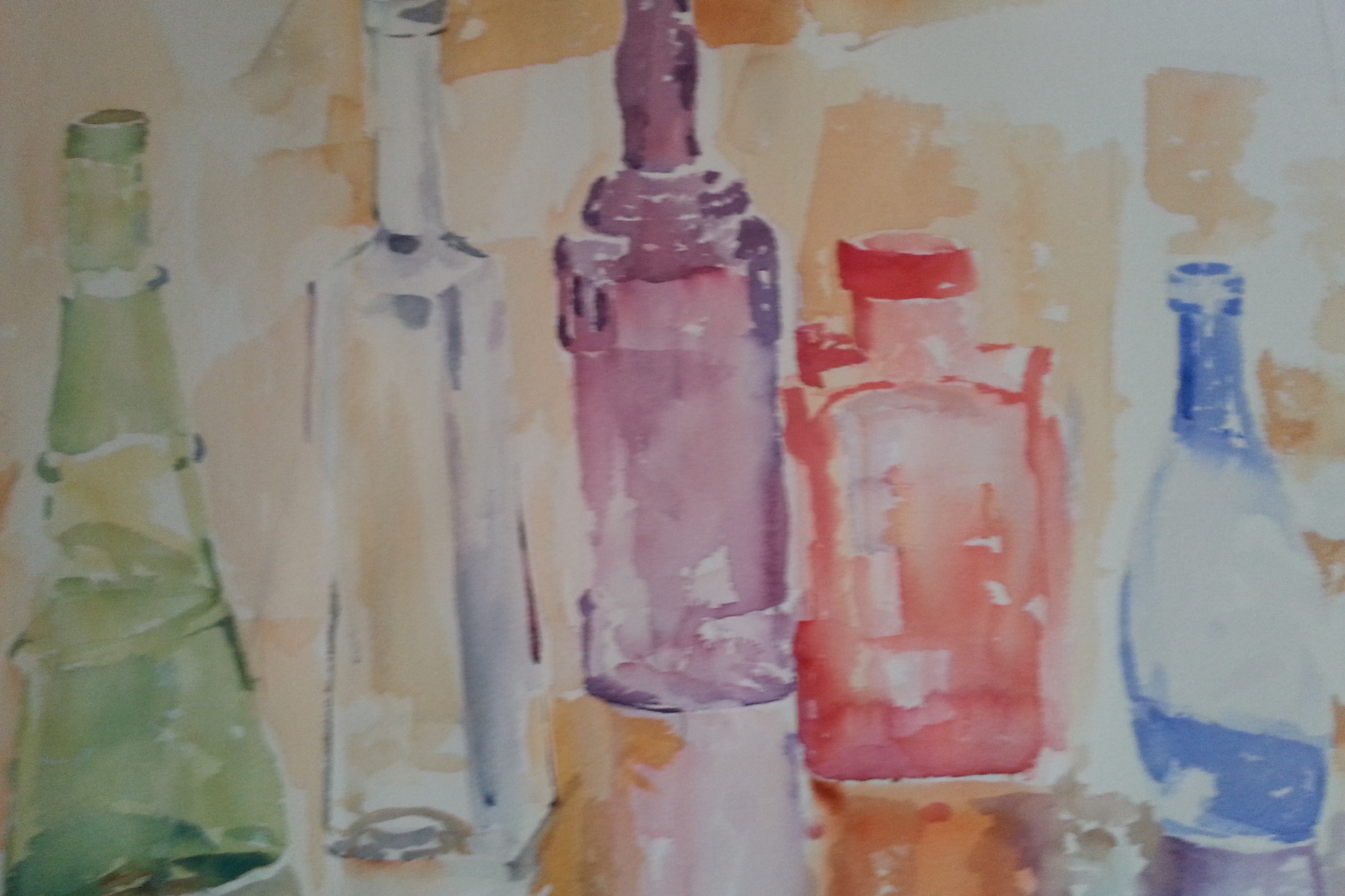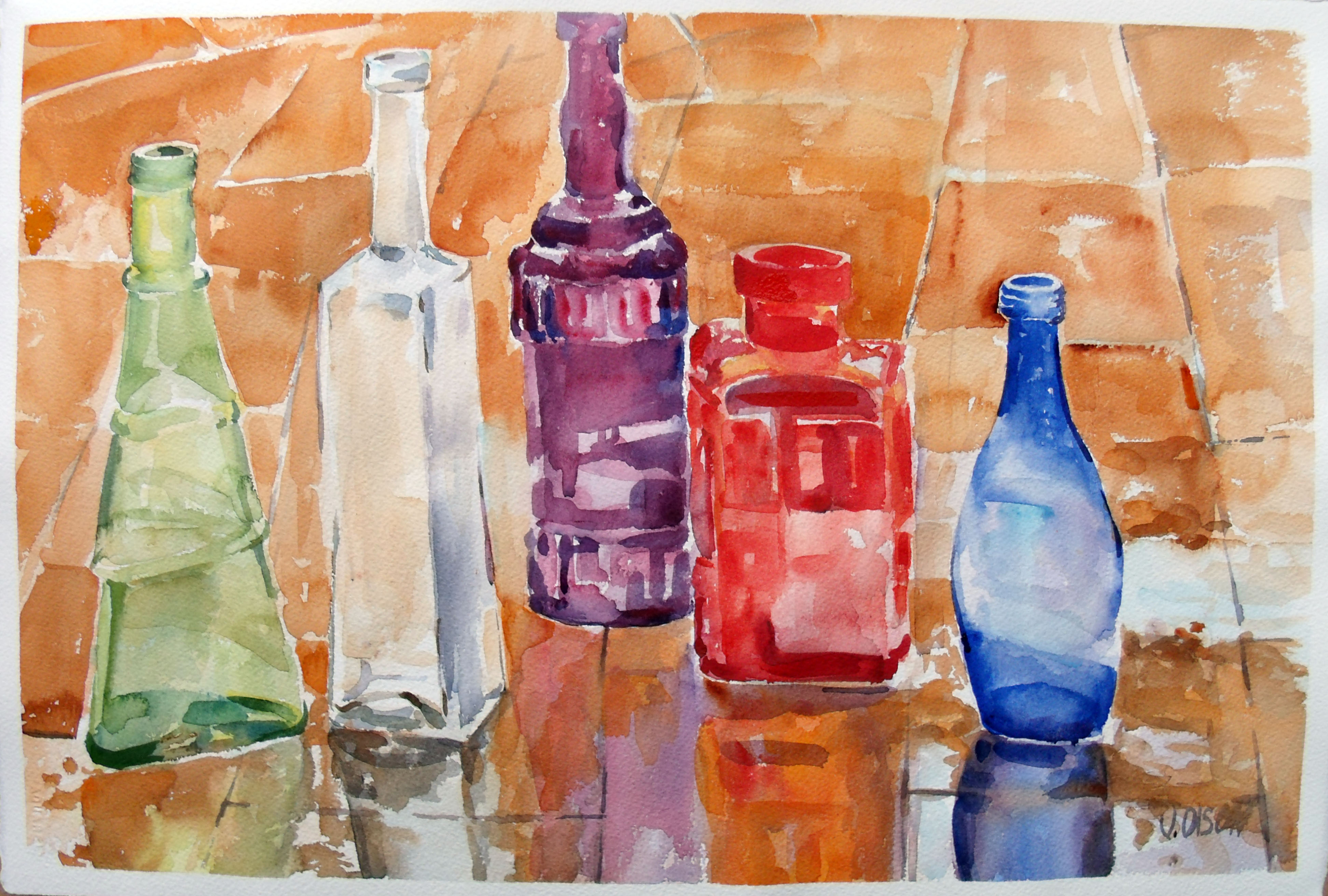 I am working on a series called ‘My Favorite Bottles’. Every time I paint them, I put them in a different place in the house so I can study the light, colors and reflections. It was raining and I thought that this was the perfect opportunity to paint reflections of the bottles on a wet floor.