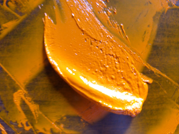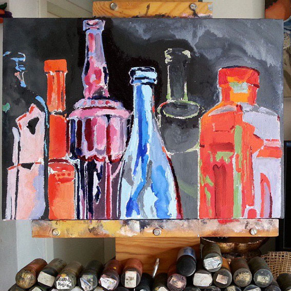 Most painters work in more than one medium because variety offers many possibilities of expression. I made a spin-off of the watercolor ‘Glass Bottles on top of Antique Closet’ in resin-oil. Resin-oil is a medium in which you mix oil with with thickened linseed oil and Venetian turpentine. This medium gives a candied effect with vivid colors. I use resin-oil in a more expressionistic manner than my watercolor and tempera paintings. I like the happy accidents and drips that show up on the canvas. There is one drawback regarding resin-oil; the room where you paint needs to have plenty of ventilation because the vapors are very strong.