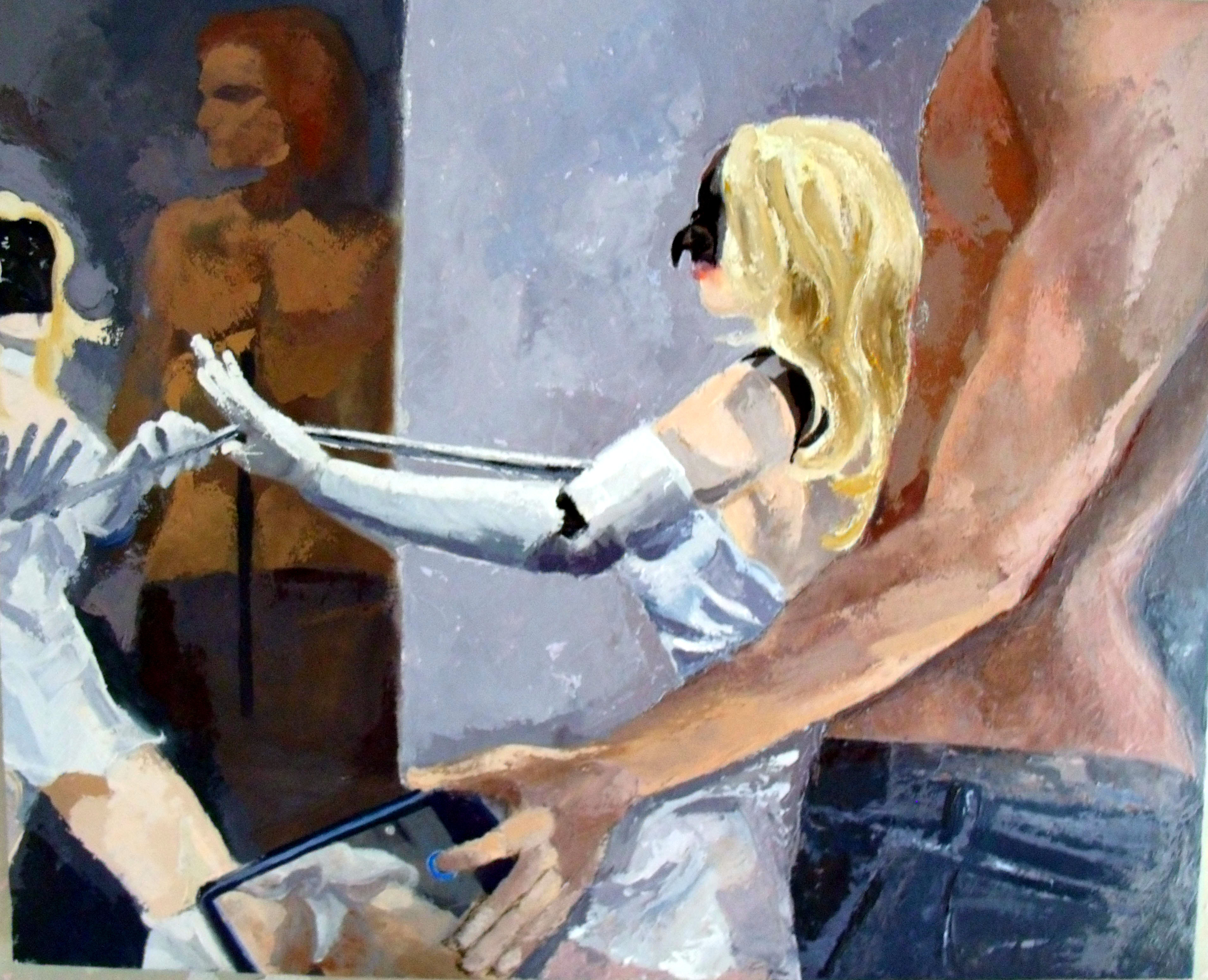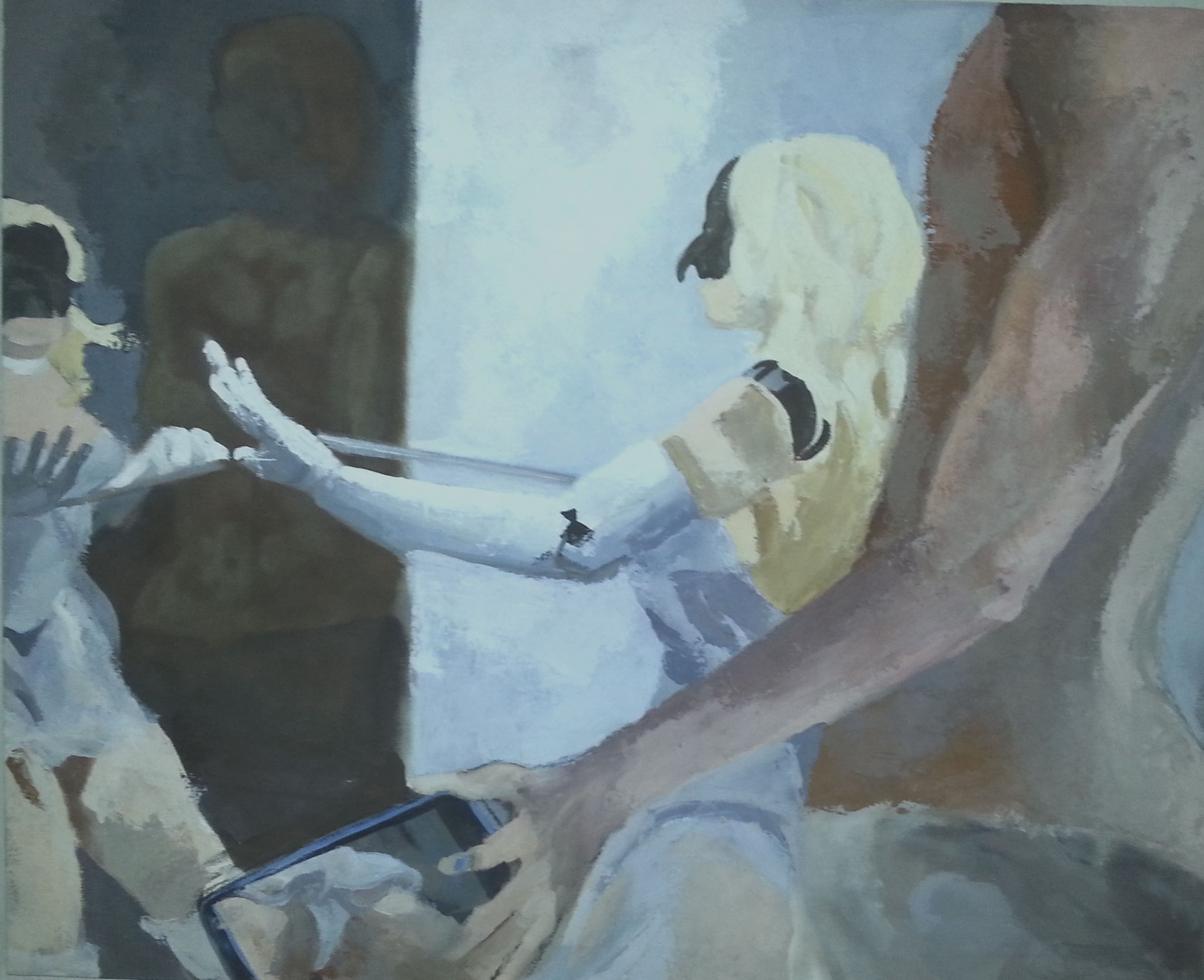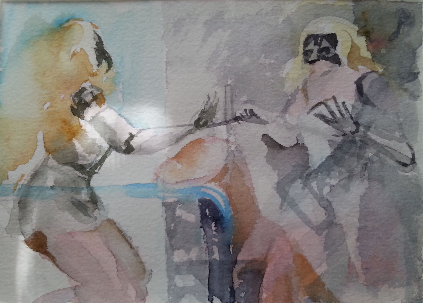 So anyway, this is just what I did. I started with five or six small rough drafts in watercolor. I picked one and started a 80 cm x 100 cm canvas painting of the watercolor in egg tempera technique. After copying the watercolor as best I could, I continued building up the idea and the paint. I finished with resin-oil which gives the finish a candied look.