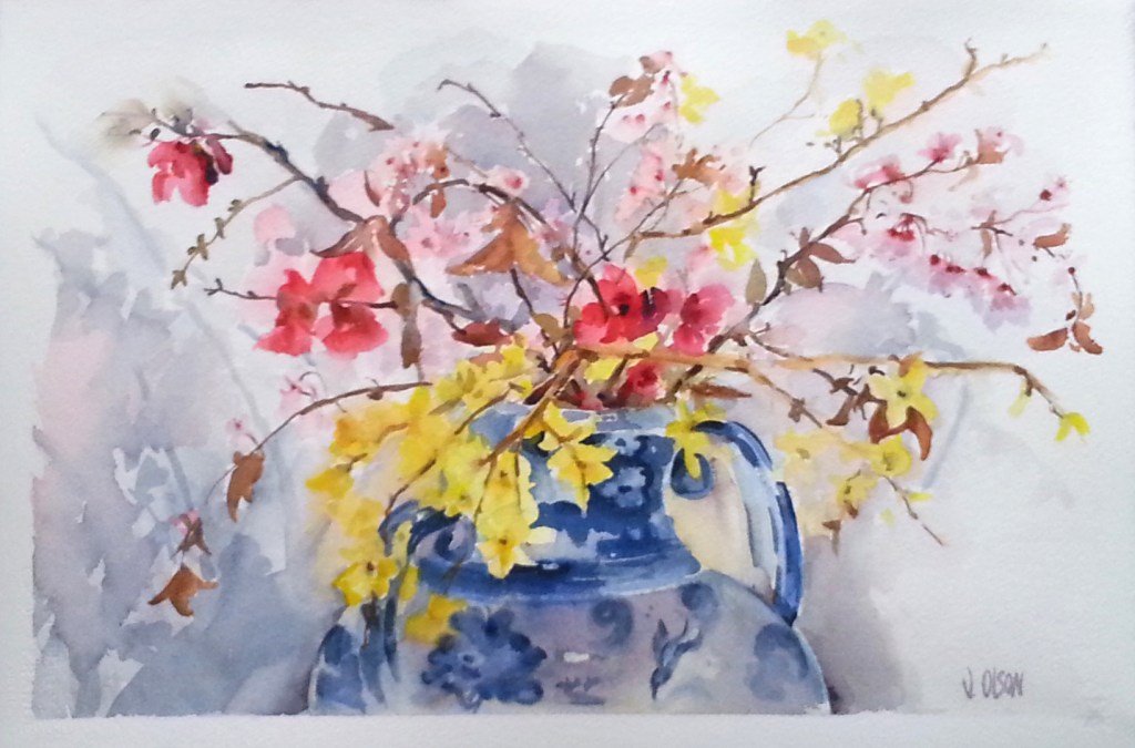 When I establish where the vase and blossoms go on the picture plane, I focus on my favorite part, respecting the whites and emphasising color.