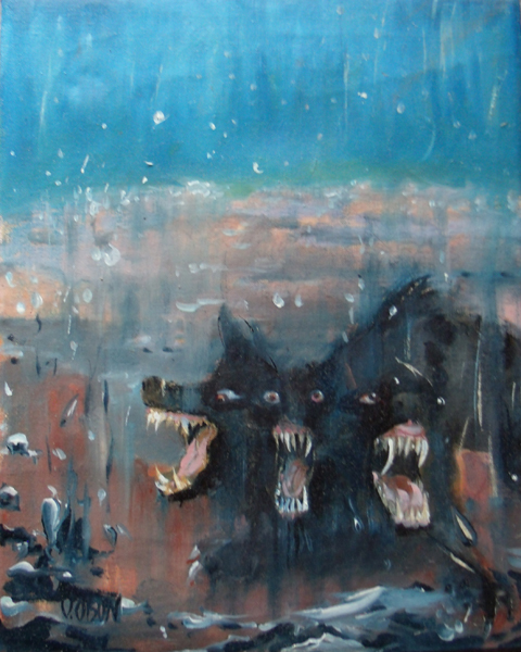 Cerberus, the three-headed, dog-like worm beast stands over the souls clawing at the slightest movement made by the supine lying in the filth.