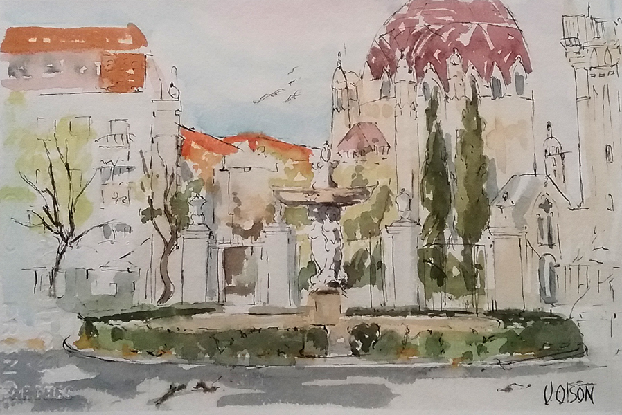 I really like this fountain a lot. It is incredibly beautiful with the Nymphs holding up the dish with dolphin-like sea creatures at their feet. This fountain has always had water shooting out of the spouts as far as I remember. I was looking forward to painting the doves that bathe on the rim of the dish. When I got there, the water had been turned off for so long that a family of feral cats was hanging around in the pond and there was a recent litter of kittens. I’m almost afraid to see what it looks like now.