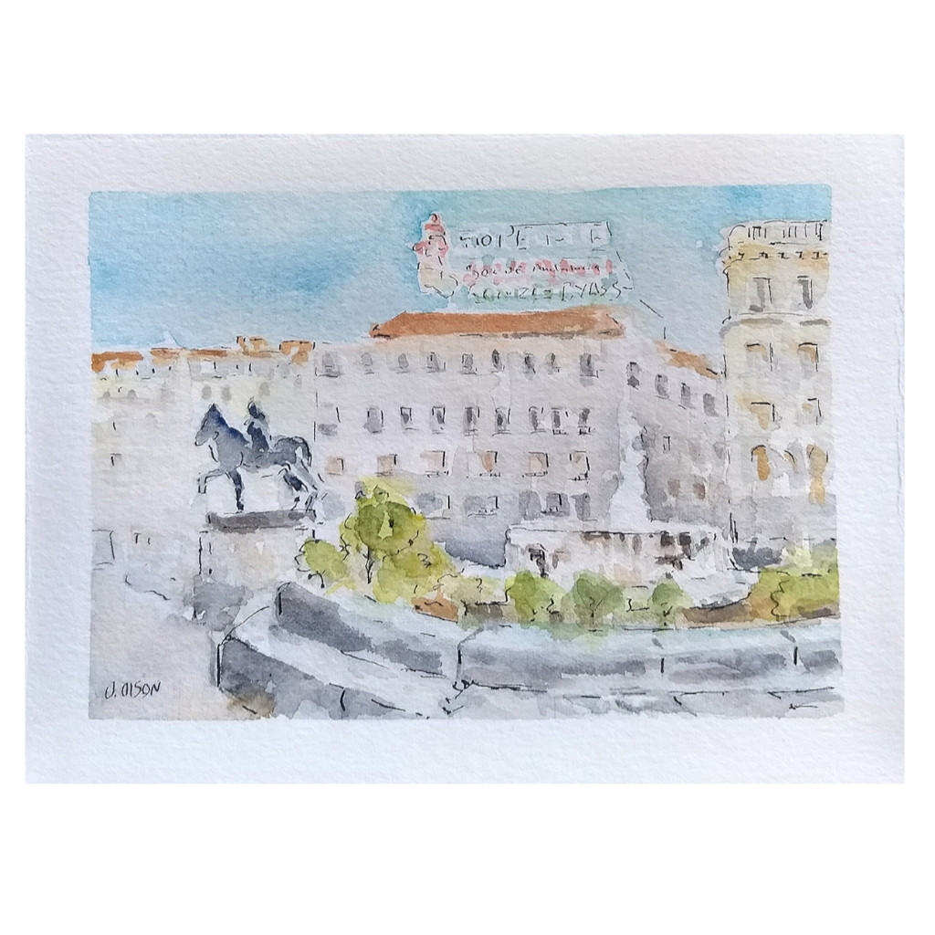 This is a very small watercolor as you can see. I wanted to make sure I could finish it in one day. It’s not easy painting at the Puerta del Sol.