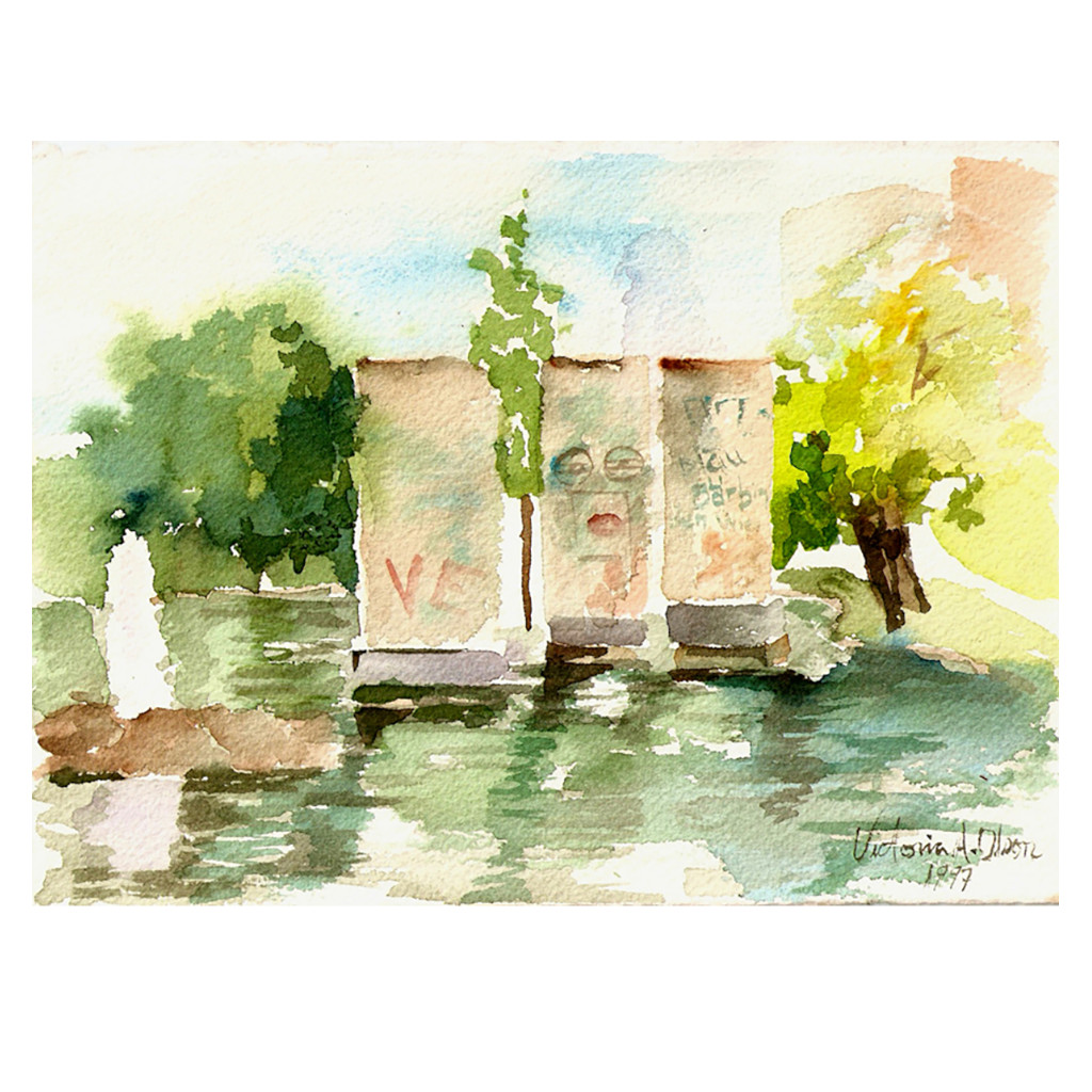 This is a postcard size watercolor which goes back in time to 1997. When I heard about this park, I went to visit it right away with my watercolors. I wanted to paint a piece of the wall. I walk by this park once and a while and the fountain itself looks the same.