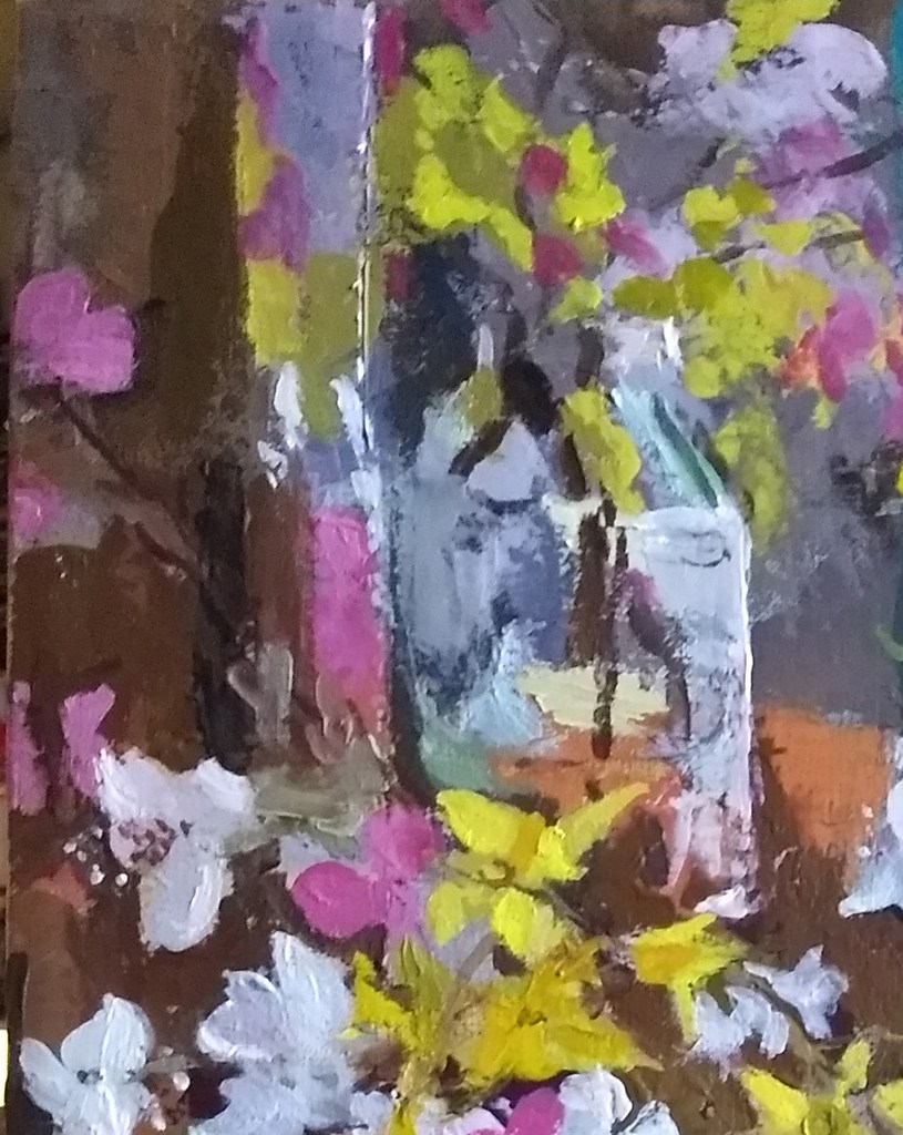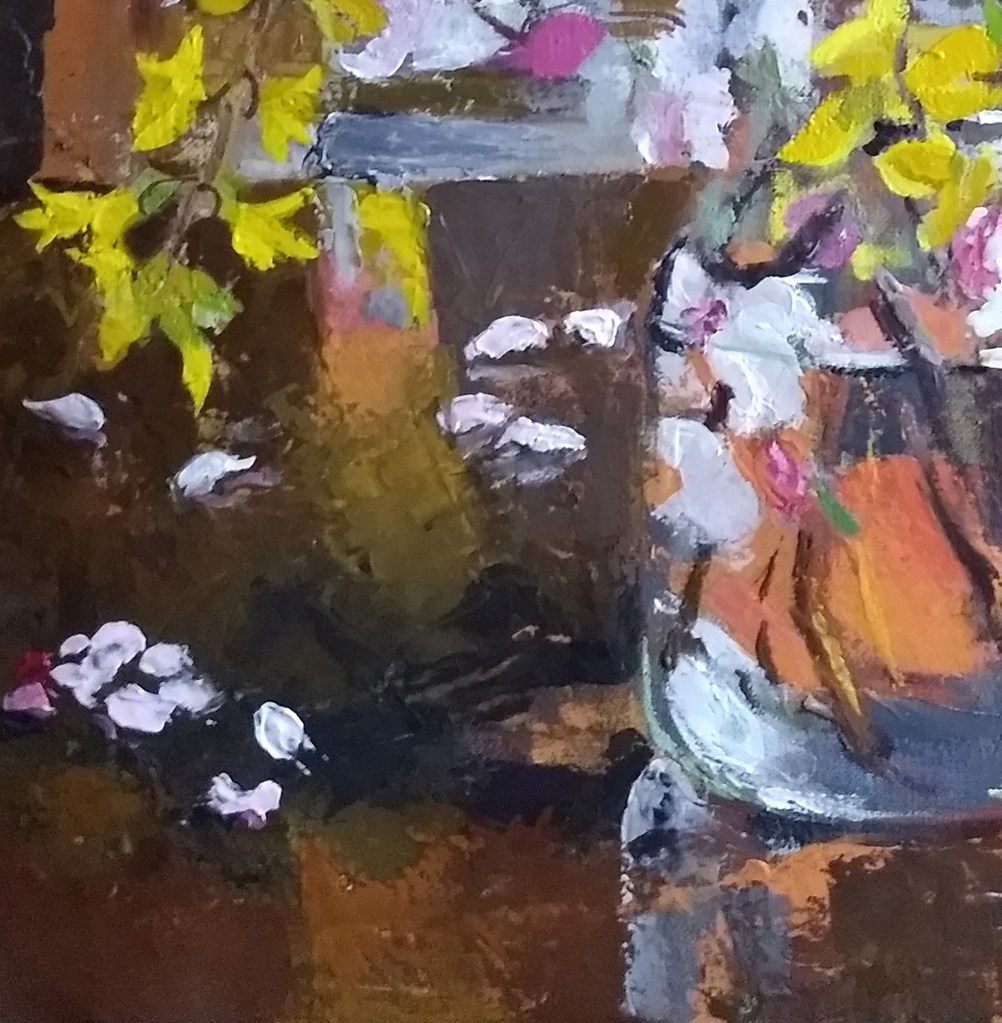 The Flowers in this painting are almond tree blossoms, Japanese scarlet quince and yellow broom retama in a pickle jar.