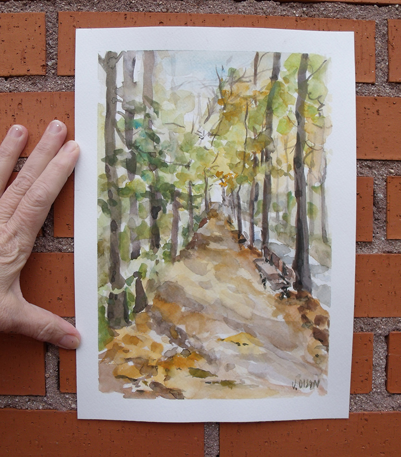 This other watercolor is one that I made in December. The autumn colors are still there. In the photo below, I had just finished the watercolor.