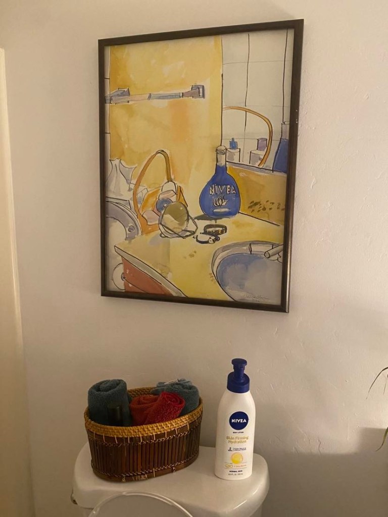 It is so fun to see a painting I made in 1986 on your wall. Thank you for framing it and sending me a picture. I like the way you put it in a similar environment and with the Nivea cream to boot.