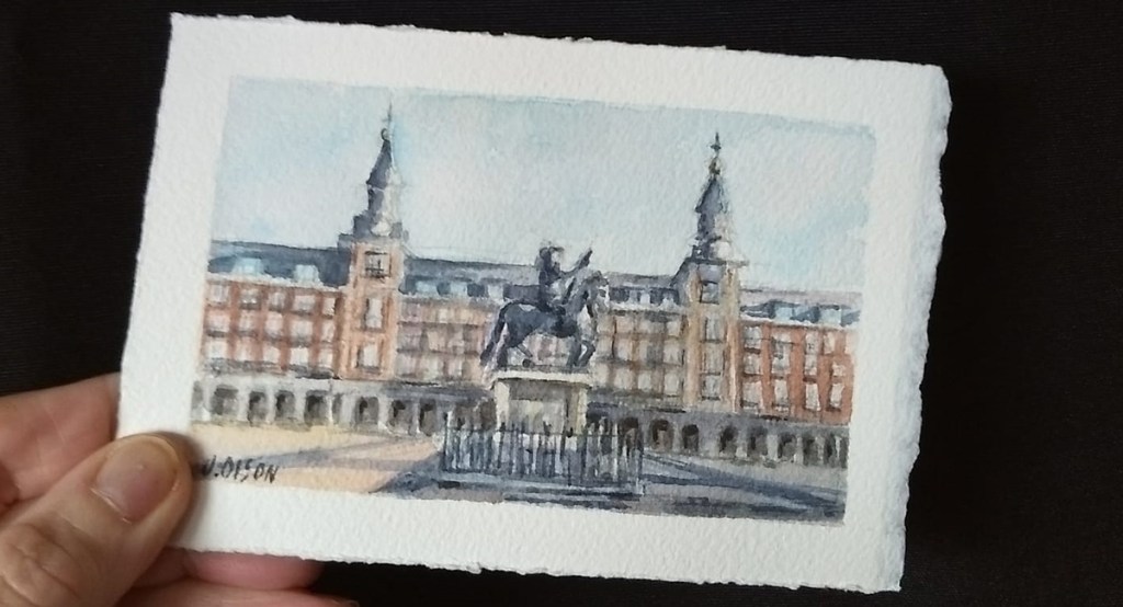 Madrid has amazing architecture. This is a watercolor of Plaza Mayor. Every Sunday morning, I cross Plaza Mayor on my way to the outdoor art market where I have an art stand. Painting this little watercolor was a lot of fun because all these memories over the years of being at the Plaza Mayor came back to me while I was painting it . On Sunday, December 31st, I will be taking this little watercolor with me to Plaza Conde de Barajas, also known as Plaza de los Pintores. You are invited to come visit us at Plaza Conde de Barajas. Thank you for reading my little story. Happy New Year!