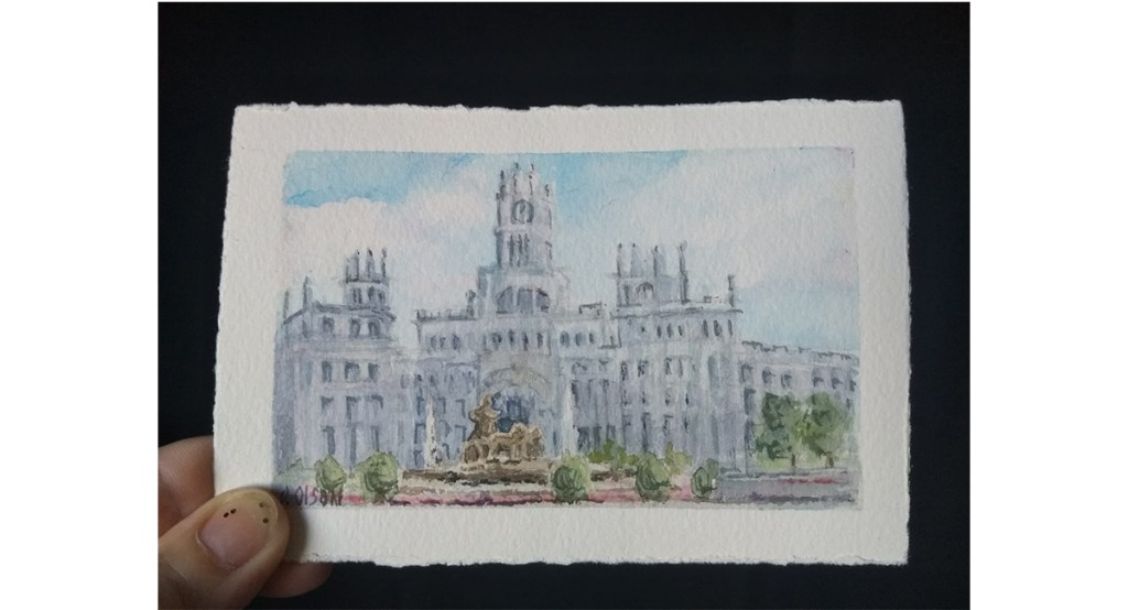 I will be bringing this tiny pocket painting of Palacio de Cibeles with me to Plaza del Conde de Barajas, also known as Plaza de los Pintores. This is an amazingly beautiful building inside and out. I remember going there when it was the post office not so long ago. I enjoy visiting and painting it. Thank you for reading my little post.