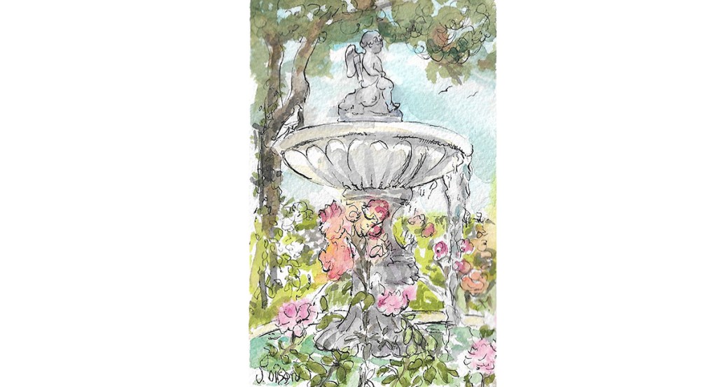 This is a tiny line and wash watercolor of little cupid sitting on a rock at the rose garden in Madrid, Spain. When you go to Retiro Park, don’t forget to go to the Rosaleda. In the Rosaleda, you will see two beautiful fountains with mythological figures on top of a rock within a cup-shaped column, the cupid fountain and the faun fountain. I love to be there in morning when it is all quiet. You can hear the water fall from the dish into the pond below.