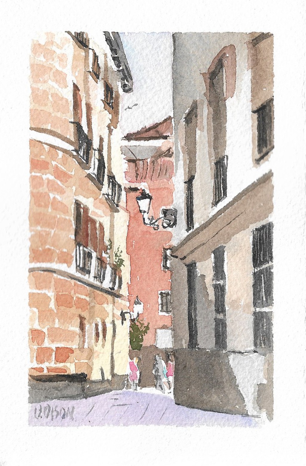 Title: Calle del Codo December 16th 2025 (Tiny Watercolor) Medium: Watercolor on Arches 300 gms Size: 9.5×14.5 cm Author: Victoria Olson O’Donnell Price 60 Euros (Free shipping)