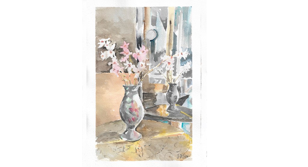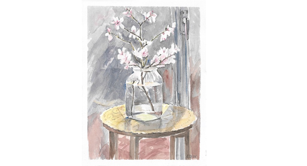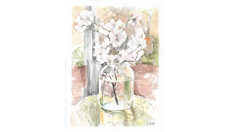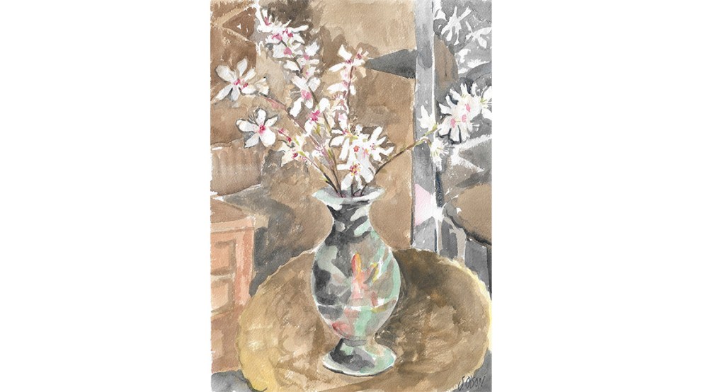 With the cold drop, the blossoms all blew away, but not before I made a line and wash in my raku pinch pot.