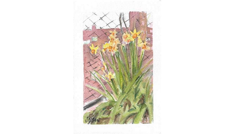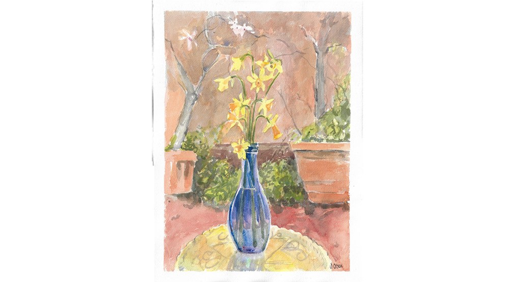 These daffodils showed up at the same time as the almond blossoms. I like the primary color combination of the blue glass water bottle and the yellow flowers.